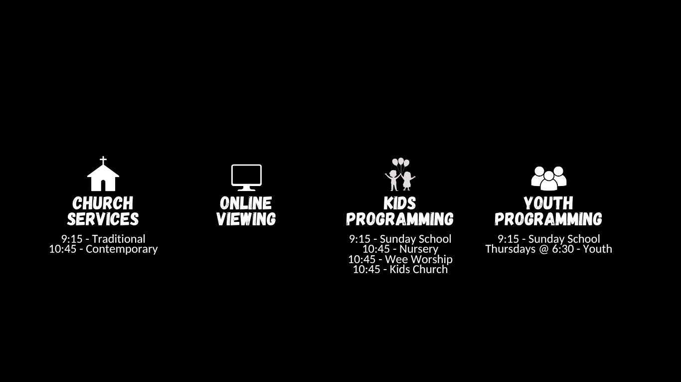 We meet on Sundays in person and online at 9:15am and 10:45am. Our 9:15 service is a traditional worship service. We offer Sunday School for all ages, including adults, at this service. Our 10:45 is more contemporary, with Nursery, Wee Worship, Kids Church, and an adult Sunday School class available at this service.